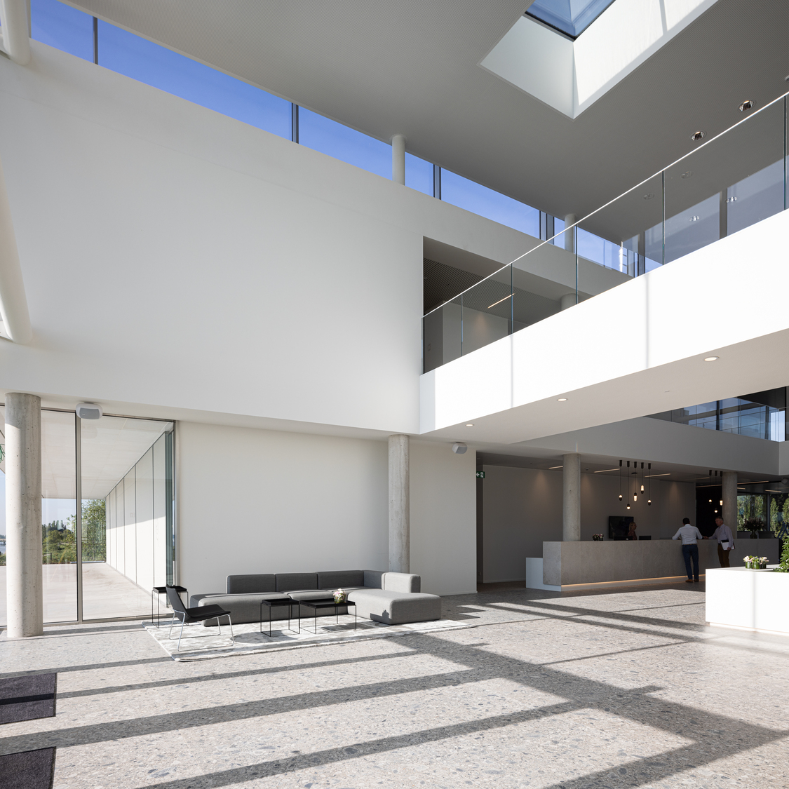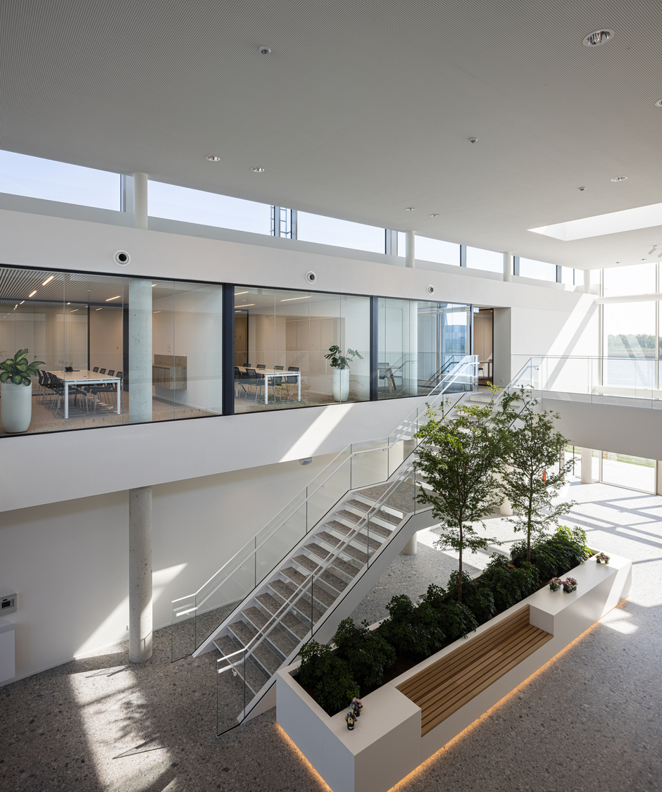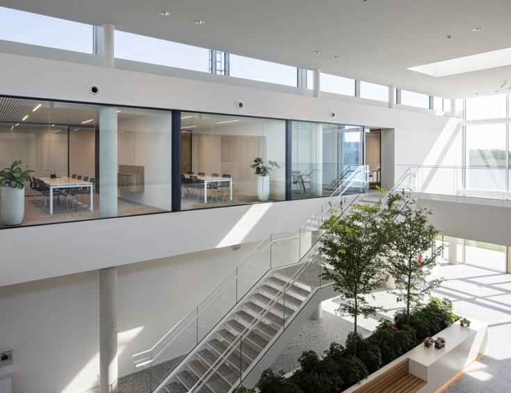 Op de gelijkvloerse verdieping bevinden zich links van het atrium vergaderzalen, een refter en een grote polyvalente zaal die met mobiele wanden kan worden opgedeeld. De rechterhelft bevat landschaps- en afgesloten kantoren. In het atrium – dat ook als centrale ontmoetingsplaats dient – is er een balie voor onthaal en administratie en een centrale trap naar de bovenverdieping. Hier bevinden zich nog meer kantoren, kleinere vergaderzalen met zicht op het atrium en de boardroom voor de directie. De kantoren zijn voorzien van verhoogde vloeren, die het bij een eventuele latere herindeling makkelijk maken om de technieken mee aan te passen. Twee loopbruggen dwars door het atrium verbinden de beide helften van de eerste verdieping met elkaar.