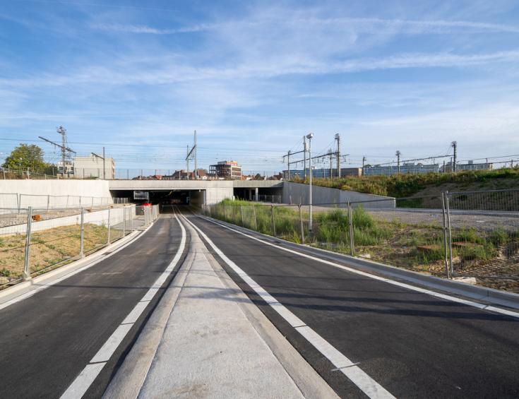 De bestaande autotunnel onder de sporen werd bovendien verlengd tot aan de voormalige kluifrotonde De Appel. De volledige bovengrondse zone werd daarna een autoluw groen plein. In die tunnel die tot -4 gaat, komen verschillende verkeersstromen – auto’s, bussen, fietsen, voetgangers – samen en erboven lopen treinsporen. Vanuit de tunnel is er een achter een wand verborgen evacuatietrap die uitkomt op het bovengelegen plein.